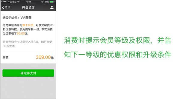 根据微信openID建立会员體(tǐ)系,告别工作人员推销和登记流程,在住店(diàn)流程中使用(yòng)微信或活动中接触酒店(diàn)公众号,即成為(wèi)酒店(diàn)“泛会员”(会员资料填写环节后置)通过微信“卡包”、微信消息等能(néng)力,对“泛会员”进行精准引导,升级会员等级,加强会员粘性。